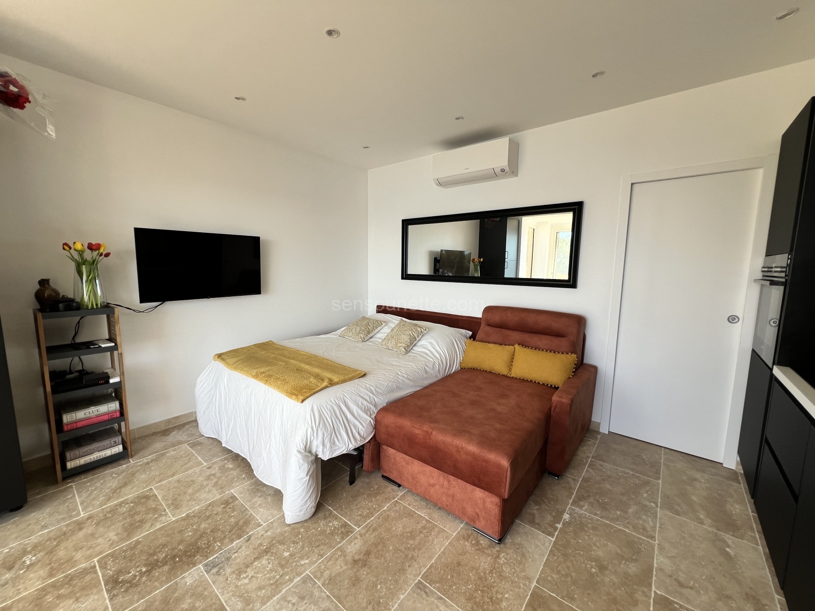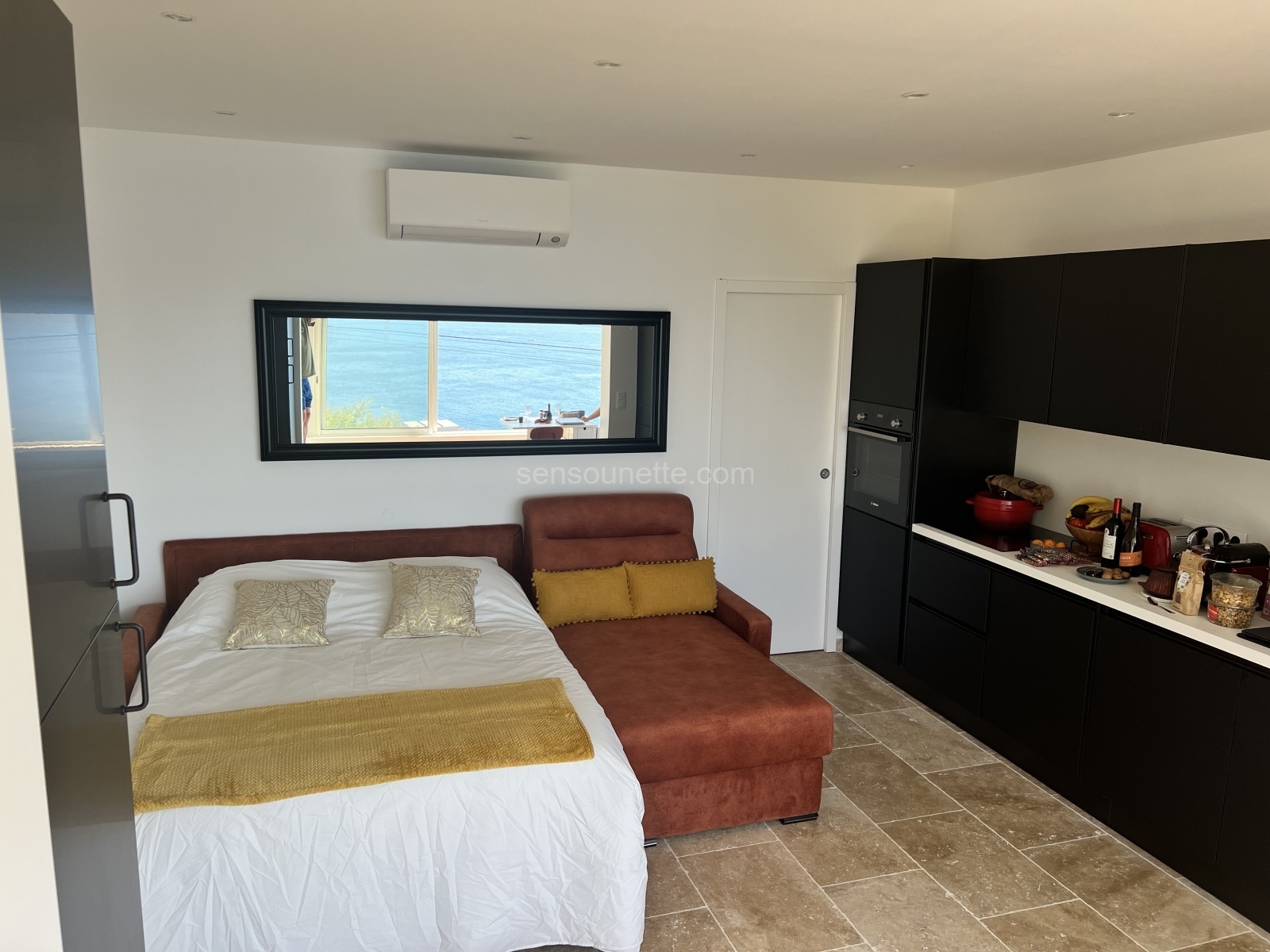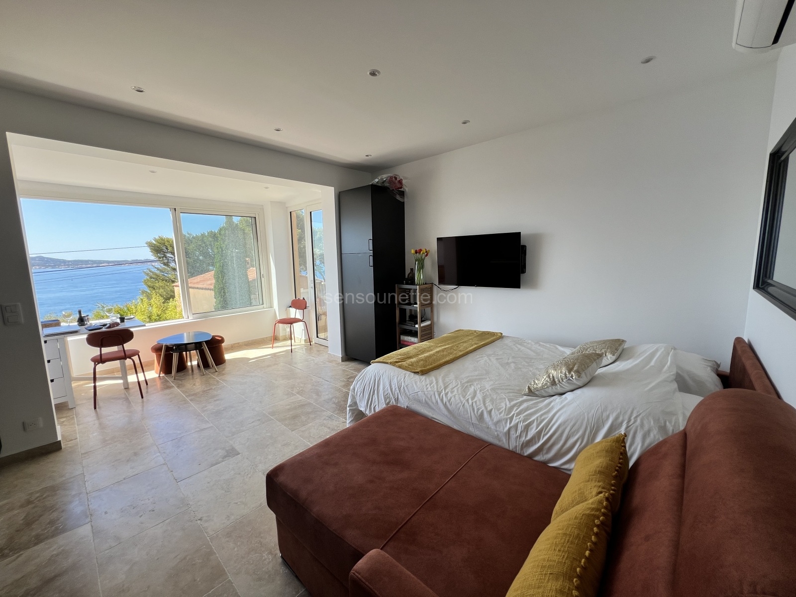 Our additional sleeping area is designed to provide a cozy and comfortable space for extra guests. The sofa easily converts into a full-size (double) sleeper, accommodating two guests with ease. The area is equipped with a swivel-mounted television and Cable TV, allowing guests to enjoy movies or their favorite shows. Wake up to the breathtaking view of Sanary Bay, thanks to the southern exposure that bathes the space in natural light. This area combines functionality with scenic beauty, making it an ideal spot for relaxation.