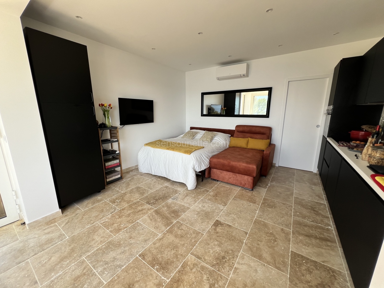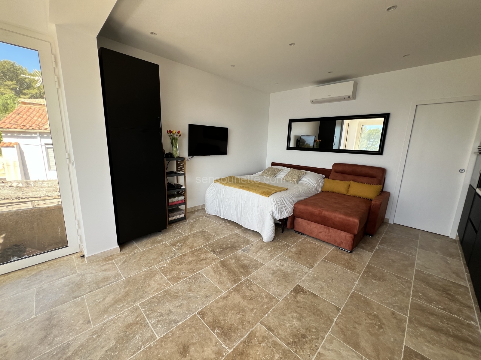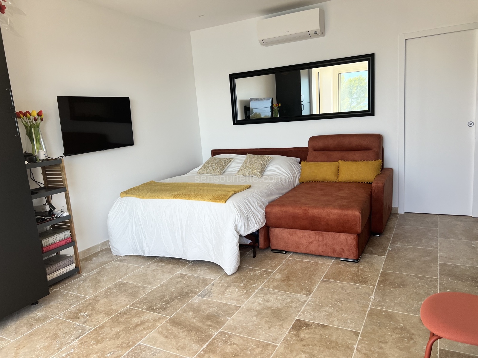 Our additional sleeping area is designed to provide a cozy and comfortable space for extra guests. The sofa easily converts into a full-size (double) sleeper, accommodating two guests with ease. The area is equipped with a swivel-mounted television and Cable TV, allowing guests to enjoy movies or their favorite shows. Wake up to the breathtaking view of Sanary Bay, thanks to the southern exposure that bathes the space in natural light. This area combines functionality with scenic beauty, making it an ideal spot for relaxation.