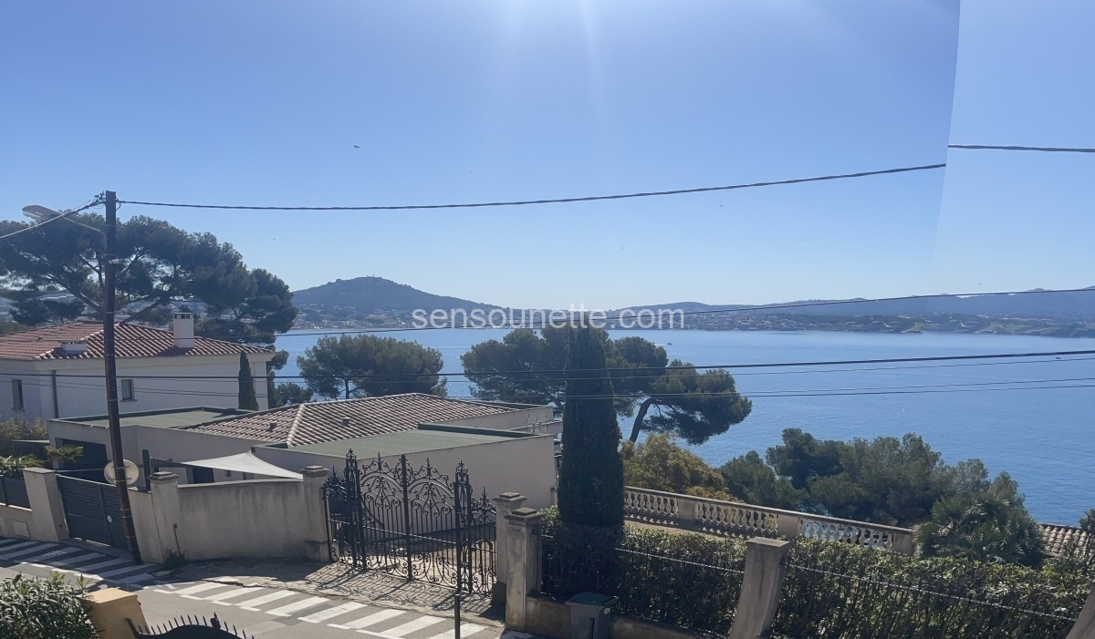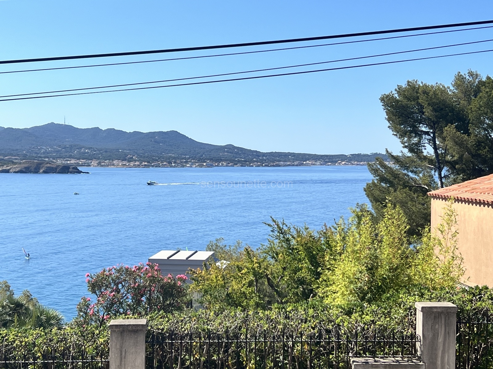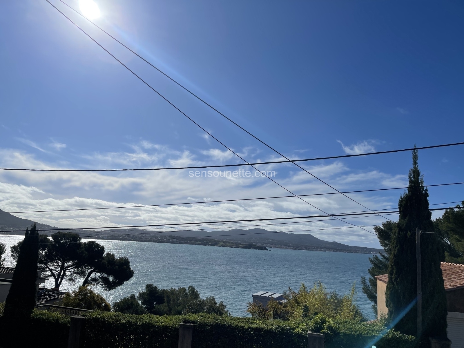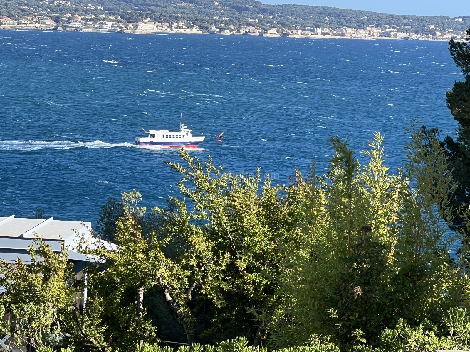 Marvel at the breathtaking panorama from the large sliding window at the front of the upper floor, which boasts a stunning southern exposure. This prime positioning allows you to bask in natural light throughout the day, enhancing the beauty of the interior spaces. Overlooking Sanary Bay, the view encompasses a lively scene of sailboats, ferries, kitesurfers, and sailboarders gracefully navigating the shimmering waters. The expansive vista also offers a sweeping look at Six-Fours-Les-Plage, Le Brusc, and a glimpse of the majestic Cap Sicié, providing a serene and picturesque backdrop that is truly captivating.