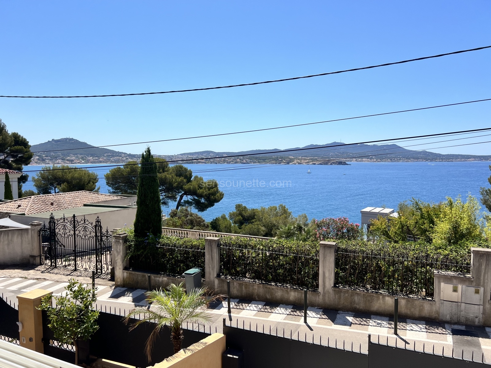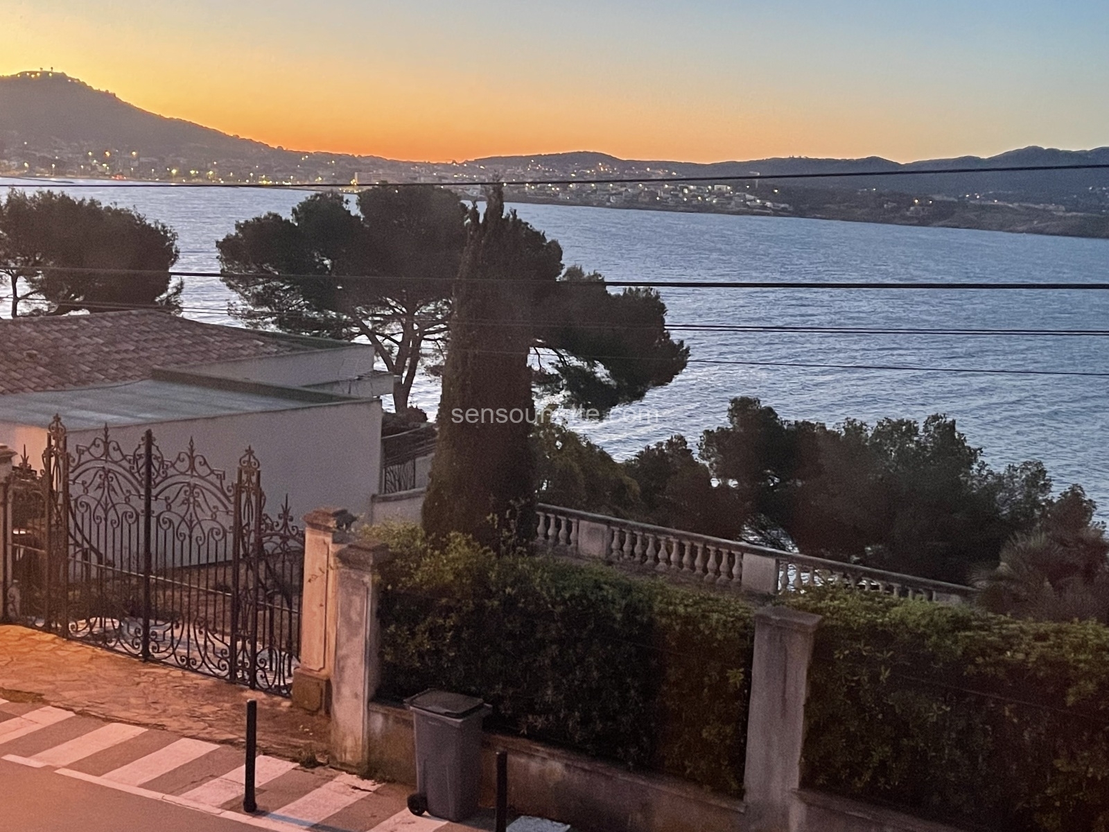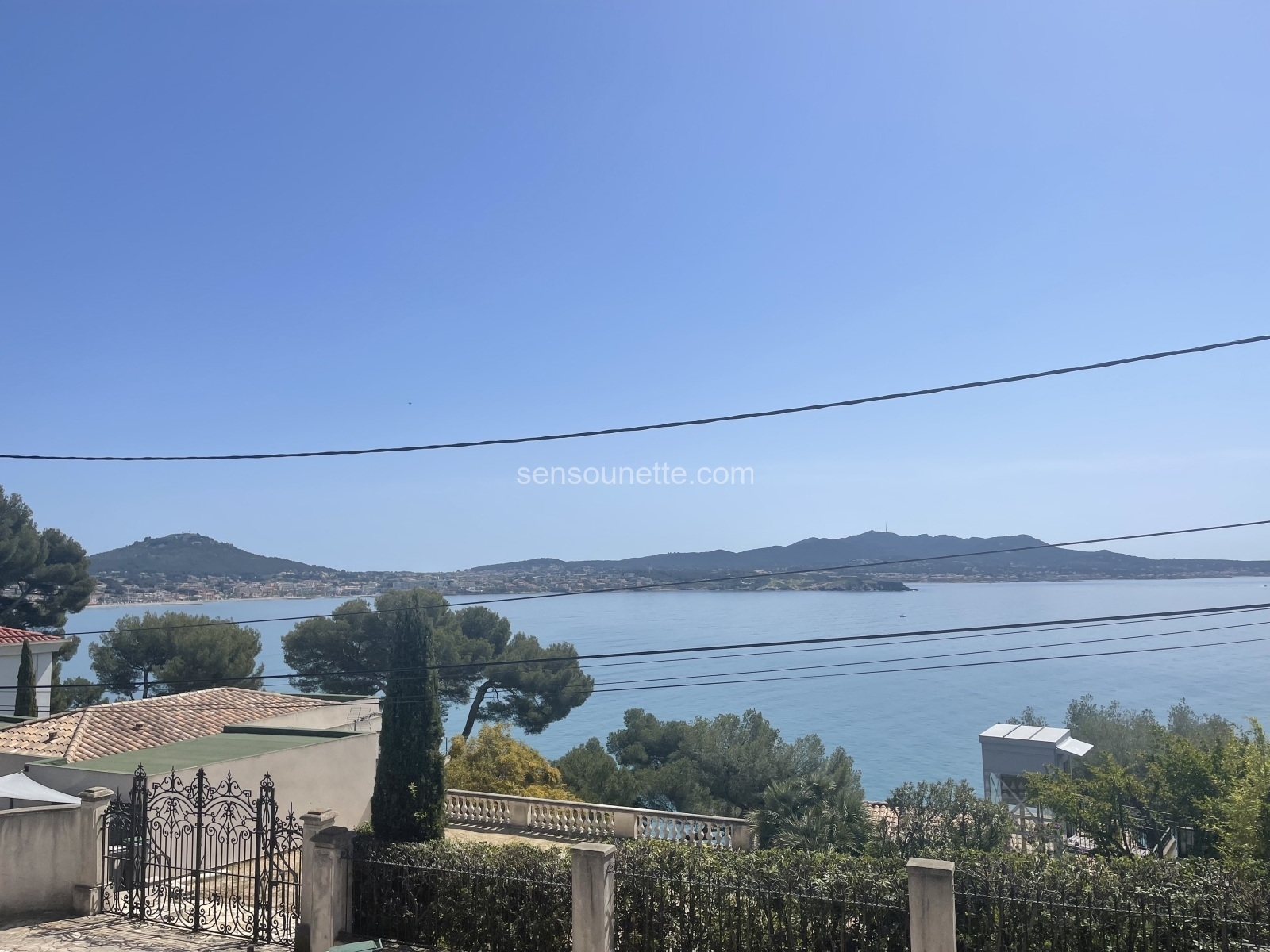 Marvel at the breathtaking panorama from the large sliding window at the front of the upper floor, which boasts a stunning southern exposure. This prime positioning allows you to bask in natural light throughout the day, enhancing the beauty of the interior spaces. Overlooking Sanary Bay, the view encompasses a lively scene of sailboats, ferries, kitesurfers, and sailboarders gracefully navigating the shimmering waters. The expansive vista also offers a sweeping look at Six-Fours-Les-Plage, Le Brusc, and a glimpse of the majestic Cap Sicié, providing a serene and picturesque backdrop that is truly captivating.