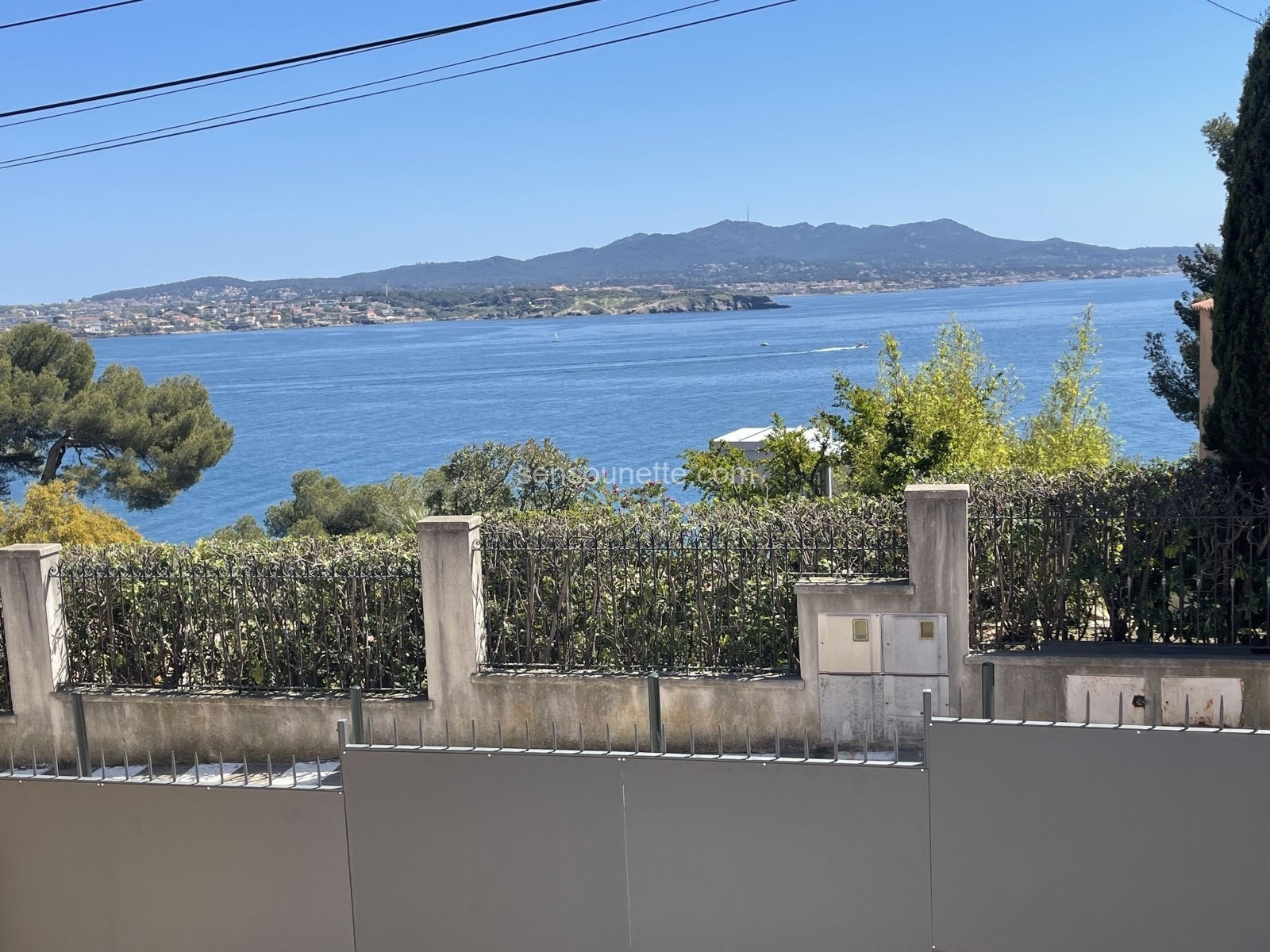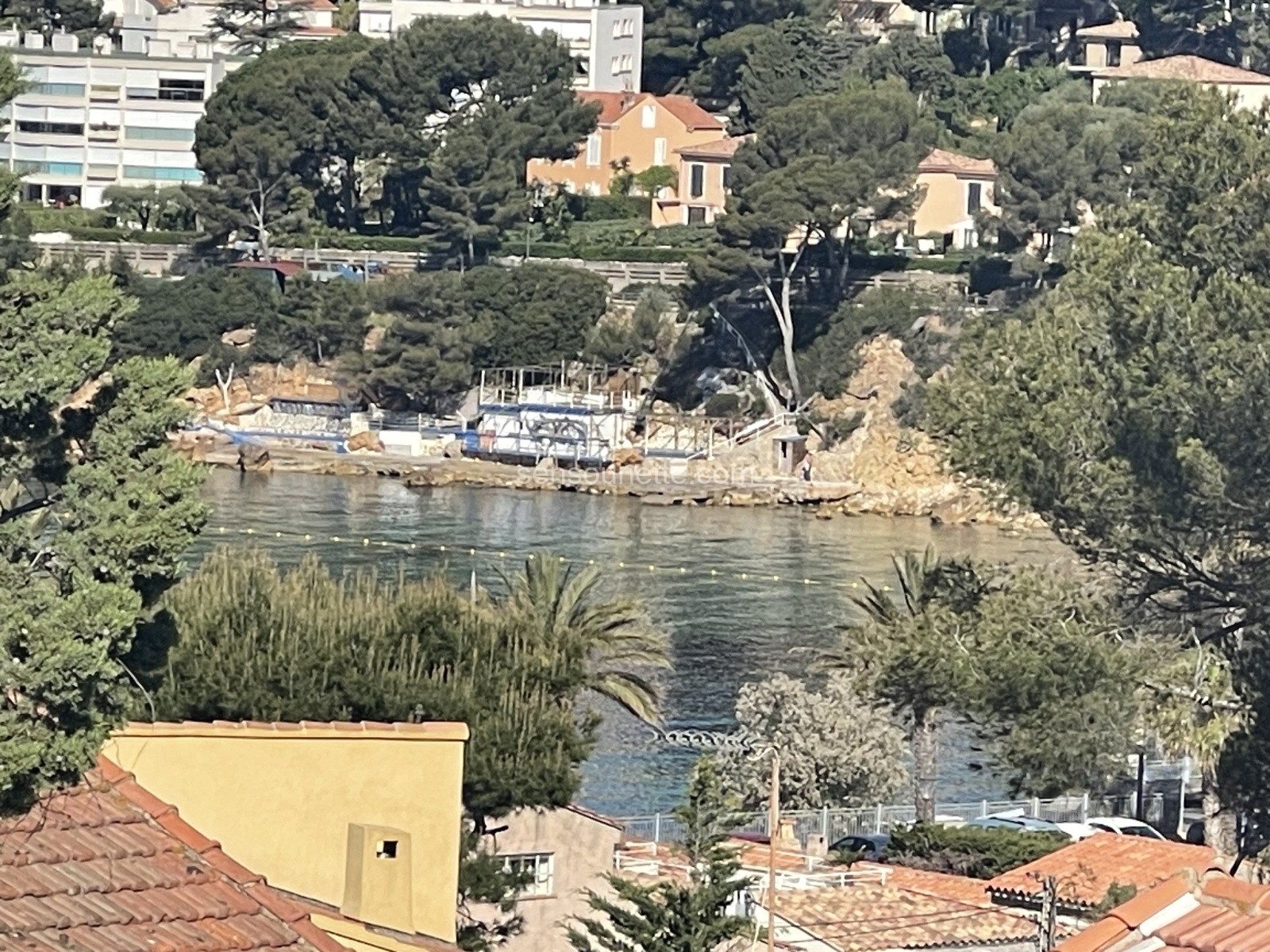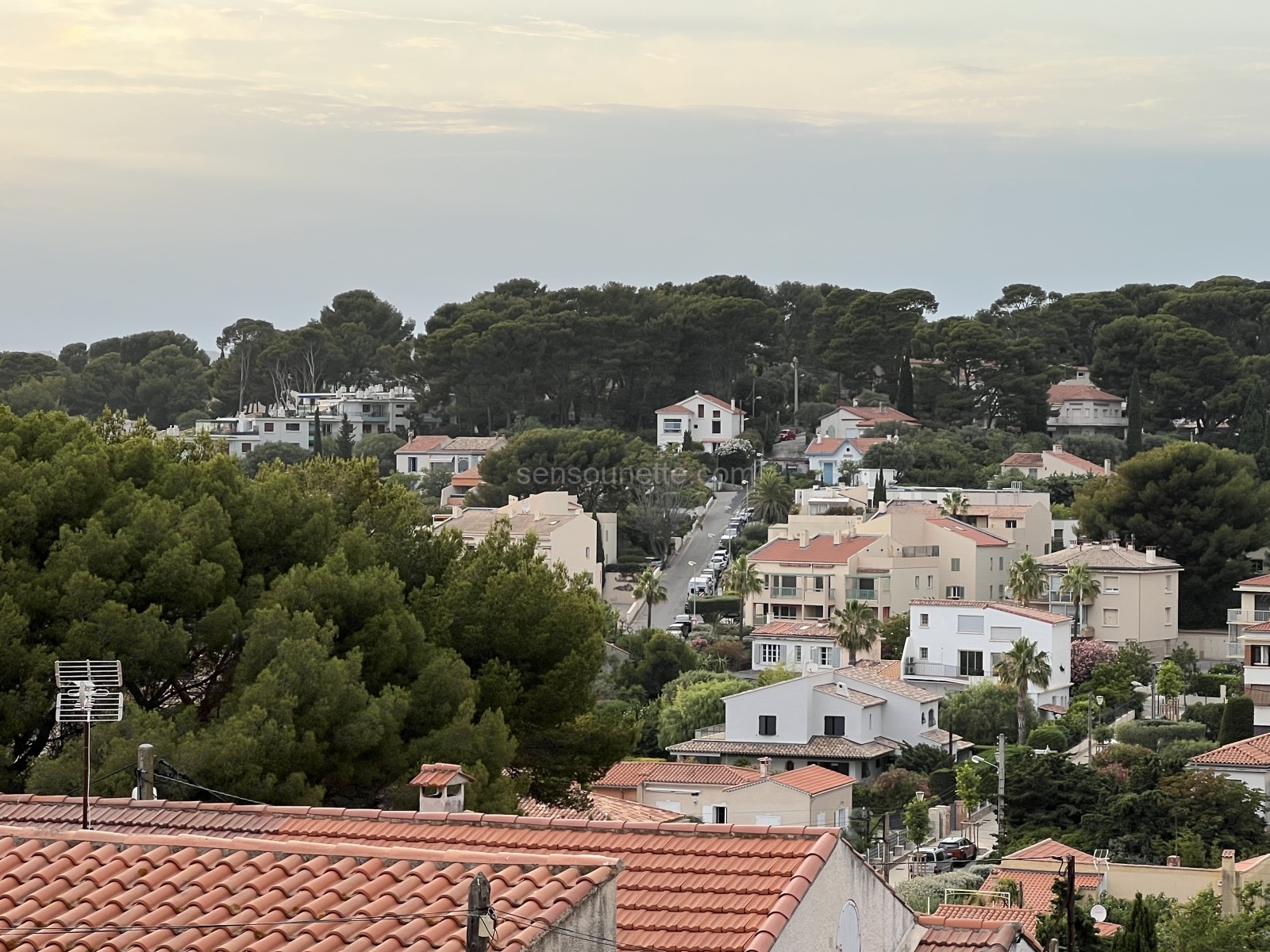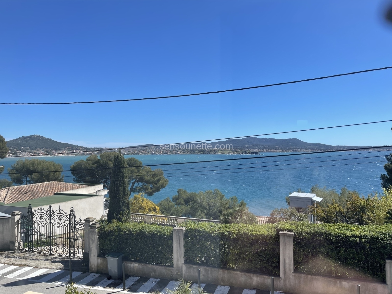 Marvel at the breathtaking panorama from the large sliding window at the front of the upper floor, which boasts a stunning southern exposure. This prime positioning allows you to bask in natural light throughout the day, enhancing the beauty of the interior spaces. Overlooking Sanary Bay, the view encompasses a lively scene of sailboats, ferries, kitesurfers, and sailboarders gracefully navigating the shimmering waters. The expansive vista also offers a sweeping look at Six-Fours-Les-Plage, Le Brusc, and a glimpse of the majestic Cap Sicié, providing a serene and picturesque backdrop that is truly captivating.